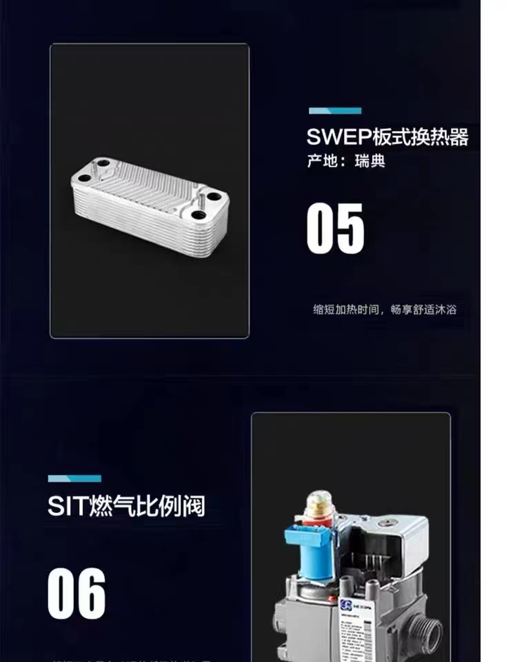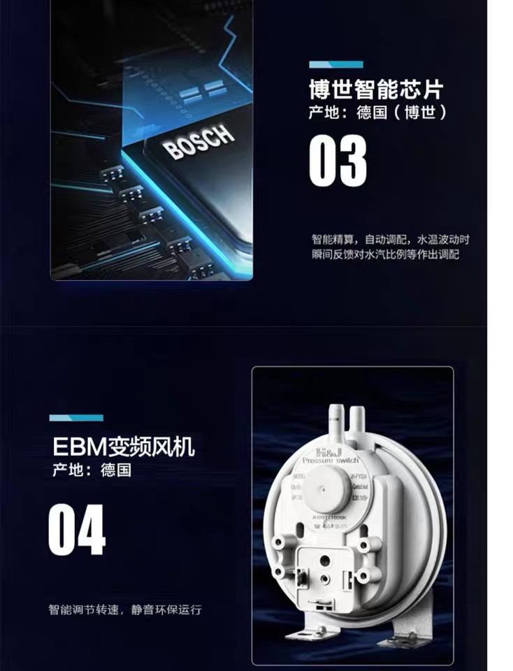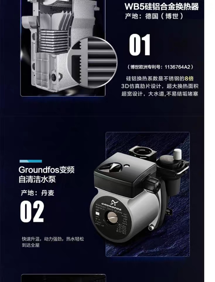 博世专利WBS高热交换器,气密设计,超静音运行:耐腐蚀性强,采用铸造工艺,无焊接,热效率高达107%: